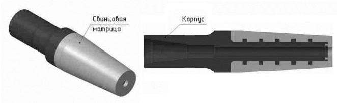 Печать свинцовая конусная состоит из корпуса, залитого свинцом. Форма заливки печати - конусная. В верхней части корпуса выполнена присоединительная резьба для соединения с колонной. В печати выполнен центральный промывочный канал для прохода промывочной жидкости.