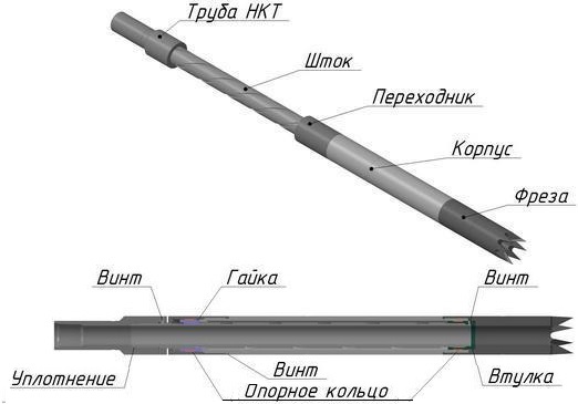 Устройство для промывки пропантовых пробок состоит из фрезы с фрезерованными цементируемыми зубьями, корпуса, винтового штока, гайки, опорных колец и уплотнений.