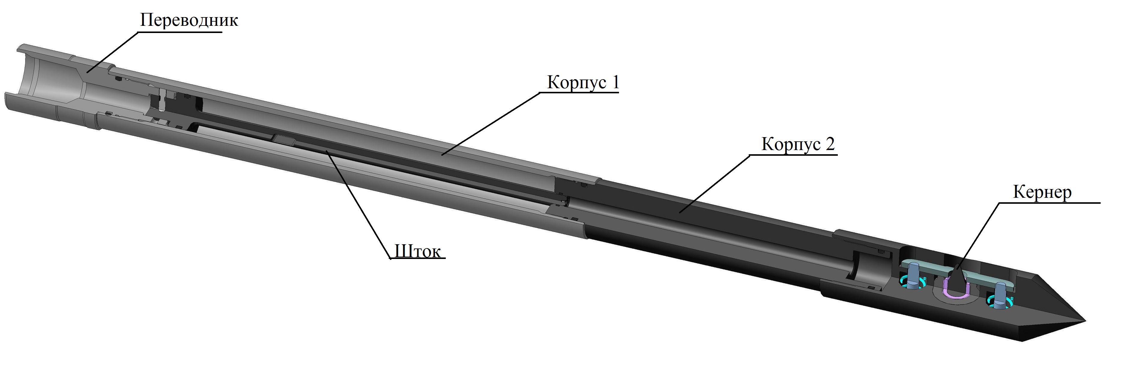 Дырокол ДГТ-М состоит из: корпуса 1, корпуса 2, поршня, керна, возвратного механизма поршня, штока, обратного клапана, наконечника, переводника, комплекта срезных штифтов, пробки прокачки и уплотнительных колец круглого сечения.